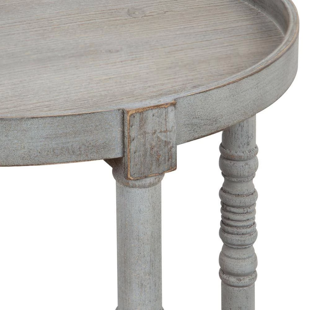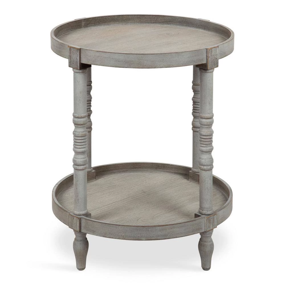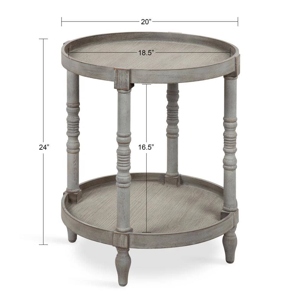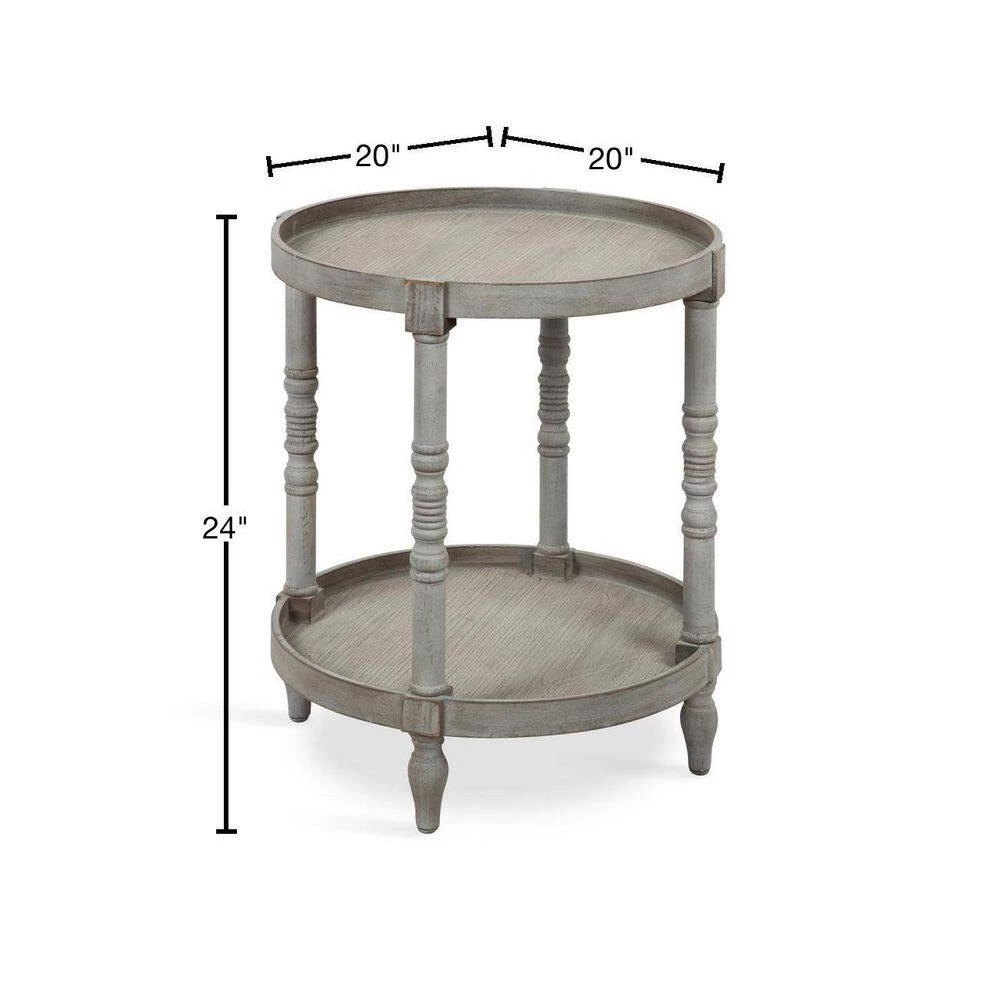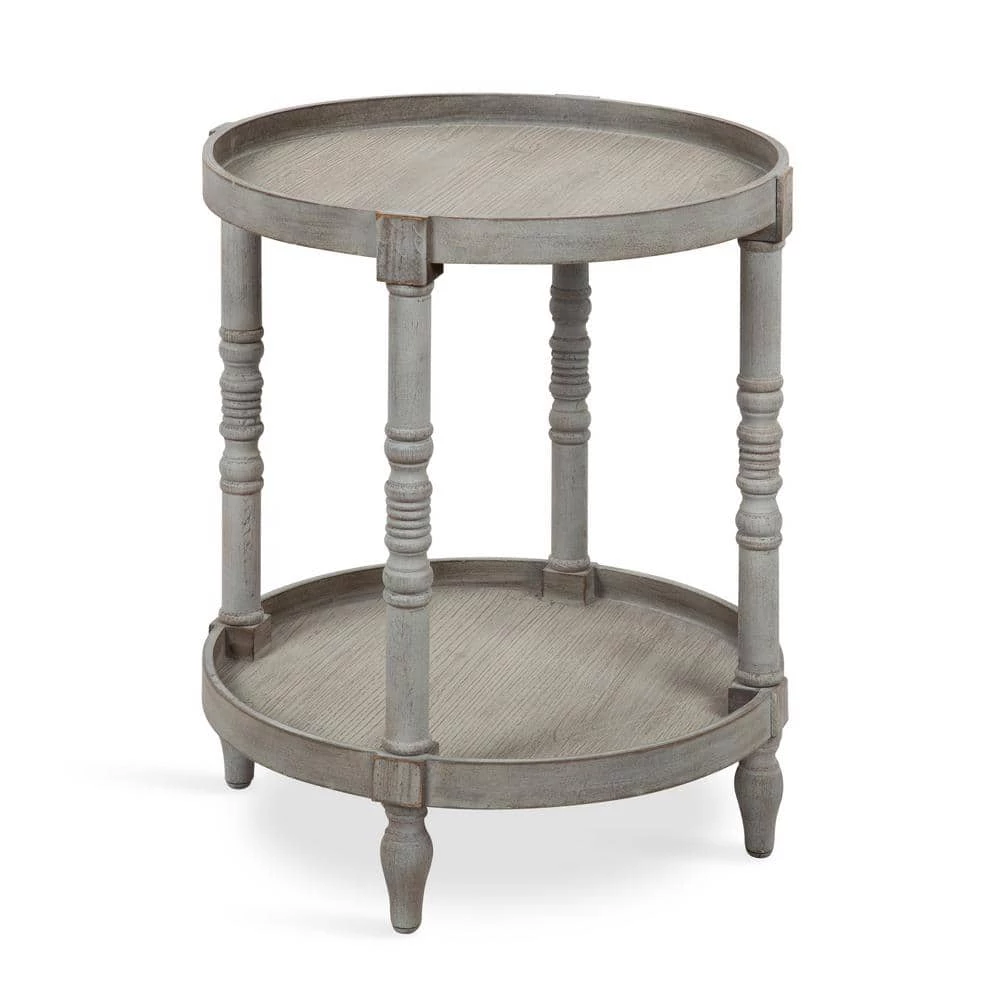 A decorative side table adds organization and style to your home. With the Bellport Round Tray Accent Table, you get all that plus a lower shelf for even more storage space. Carefully built to last for years to come, it features a large tabletop and classic silhouette that makes it perfect for lots of spaces. The design is a farmhouse chic or even rustic coastal style that will look gorgeous with most home decors. The legs are in a spindle shape attached to the top and bottom shelves for structural integrity and decorative interest. It will be a lovely fit next to a sofa or chair or paired with a houseplant next to a window. The overall dimensions are 20-inches in diameter by 24-inches tall.