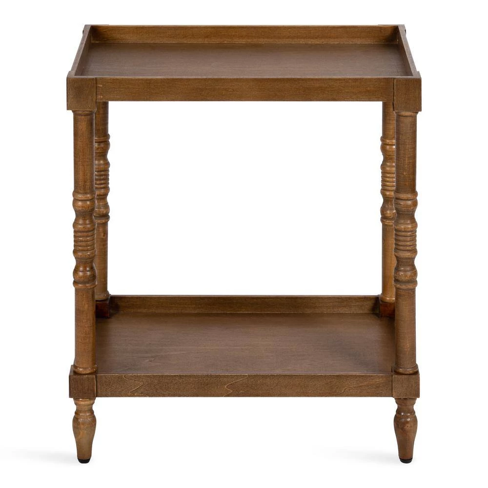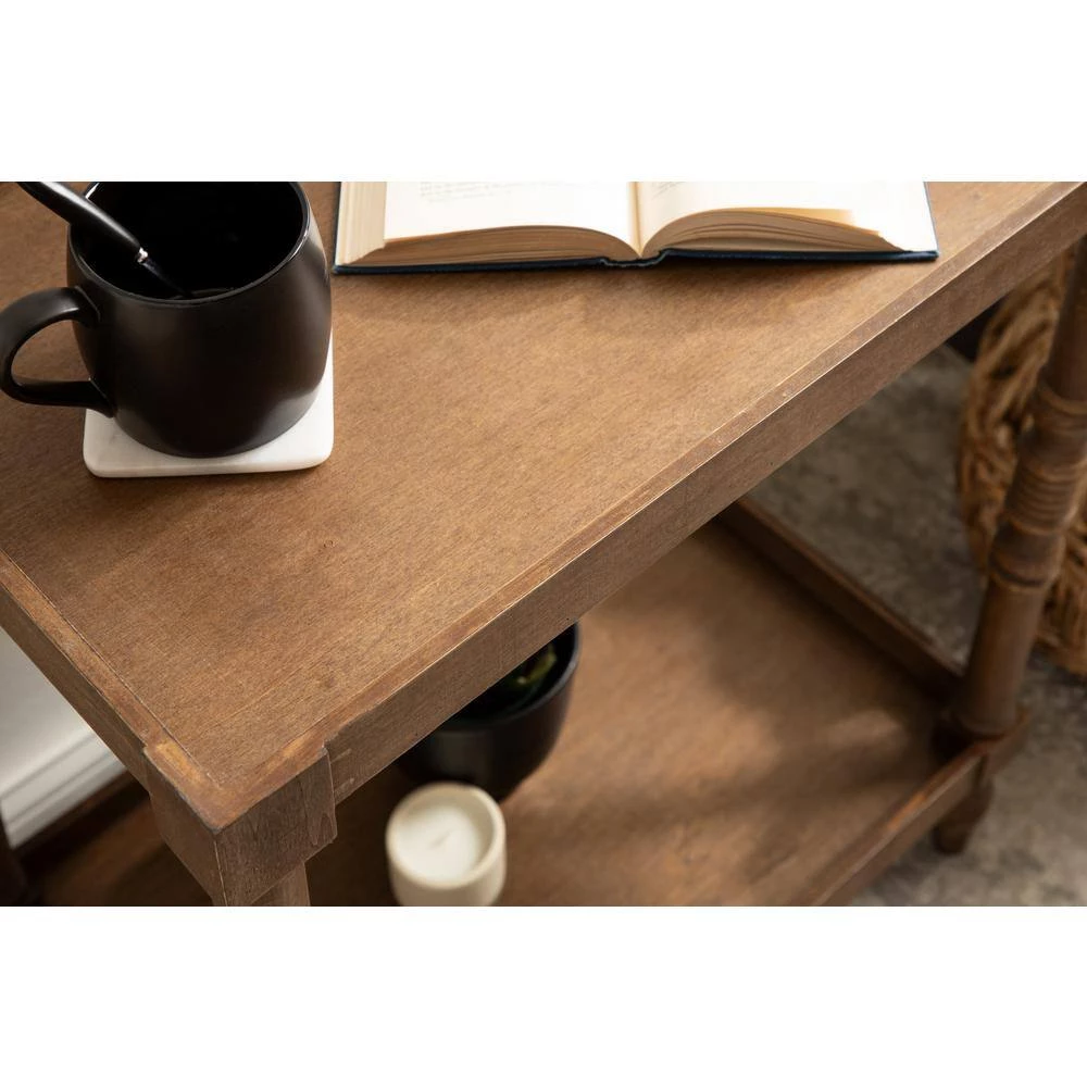 Add a decorative endcap to your living room or bedroom with the sophisticated Bellport table. Inspired by the charm of old-school farmhouses, the Bellport features a rectangular shape with colonial-style turned legs and a distressed rustic brown finish. It’s the perfect way to showcase vintage style while providing a practical storage and display area. This end table features a tabletop and a lower storage tier for a multi-faceted statement piece. Each Bellport was constructed from a lightweight yet resilient blend of wooden material for a resilient yet elegant look. Use this table to showcase decorative accents like faux plants, photos, statues, and more. Both tabletop tiers are also great for storing books, pillows, blankets, media, and small lamps. The Bellport’s dimensions are 22 in. wide x 14 in. deep x 26 in. tall , making it a great addition next to your couch, entryway, bed, or armchair. It will also be ready to use in a matter of seconds with a simple assembly process. All you have to do is screw in each of the four legs and you’re ready for display.