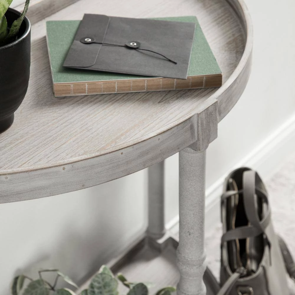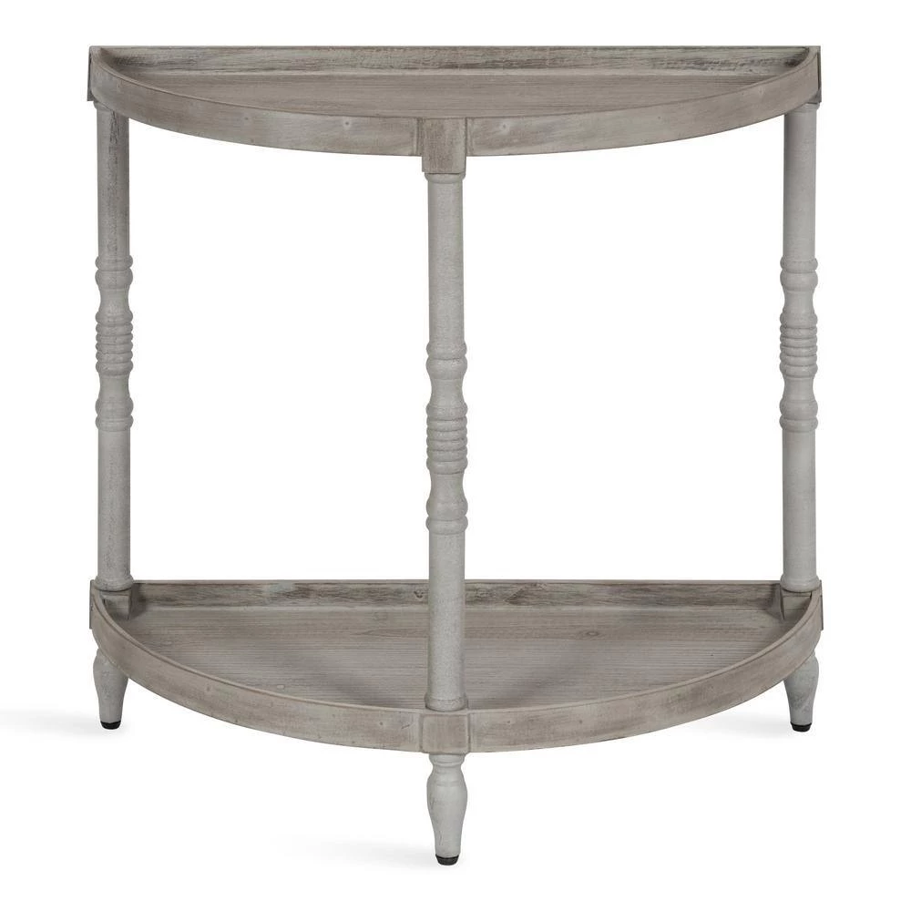 Elevate your home with a farmhouse flair by adding the Bellport console table. Incorporating vintage aesthetics within its design, the Bellport console features a half-moon shape with 4-colonial-style turned legs. The entire table was made from a lightweight blend of wooden materials, making it beautiful and functional. The 2-tier design, featuring a tabletop and a lower wooden surface, is perfect for both storage and display. With dimensions of 30 in. wide x 14 in. deep x 30 in. tall, the Bellport gives you plenty of space to showcase some lovely greenery, candles, and vases. You can also use the tabletop as a catch-all surface for keys and other household necessities. The lower tier is great for storing blankets, pillows, and other items. The Bellport is perfect for use in a bedroom, entryway, living room, or dining room as a striking accent piece. The assembly process for this accent table is quick and easy, requiring no tools to allow you a hassle-free table in a matter of seconds.