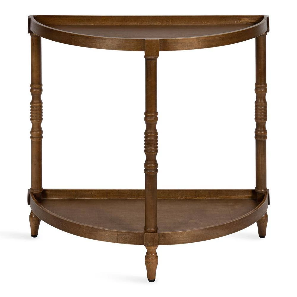 Elevate your home with a farmhouse flair by adding the Bellport console table. Incorporating vintage aesthetics within its design, the Bellport console features a half-moon shape with 4-colonial-style turned legs. The entire table was made from a lightweight blend of wooden materials, making it beautiful and functional. The 2-tier design, featuring a tabletop and a lower wooden surface, is perfect for both storage and display. With dimensions of 30 in. wide x 14 in. deep x 30 in. tall, the Bellport gives you plenty of space to showcase some lovely greenery, candles, and vases. You can also use the tabletop as a catch-all surface for keys and other household necessities. The lower tier is great for storage of your once-in-a-while items, like blankets and pillows, or for seasonal decor like adorable snowmen, spooky ghosts, or other figurines. The Bellport looks great for use in a bedroom, entryway, living room, or dining room as a striking statement piece. The assembly process for this accent table is quick and easy, requiring no tools to allow you a hassle-free table in a matter of seconds.