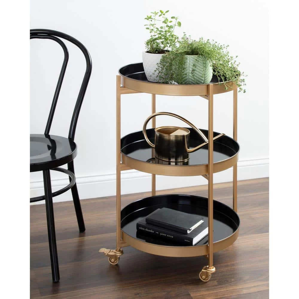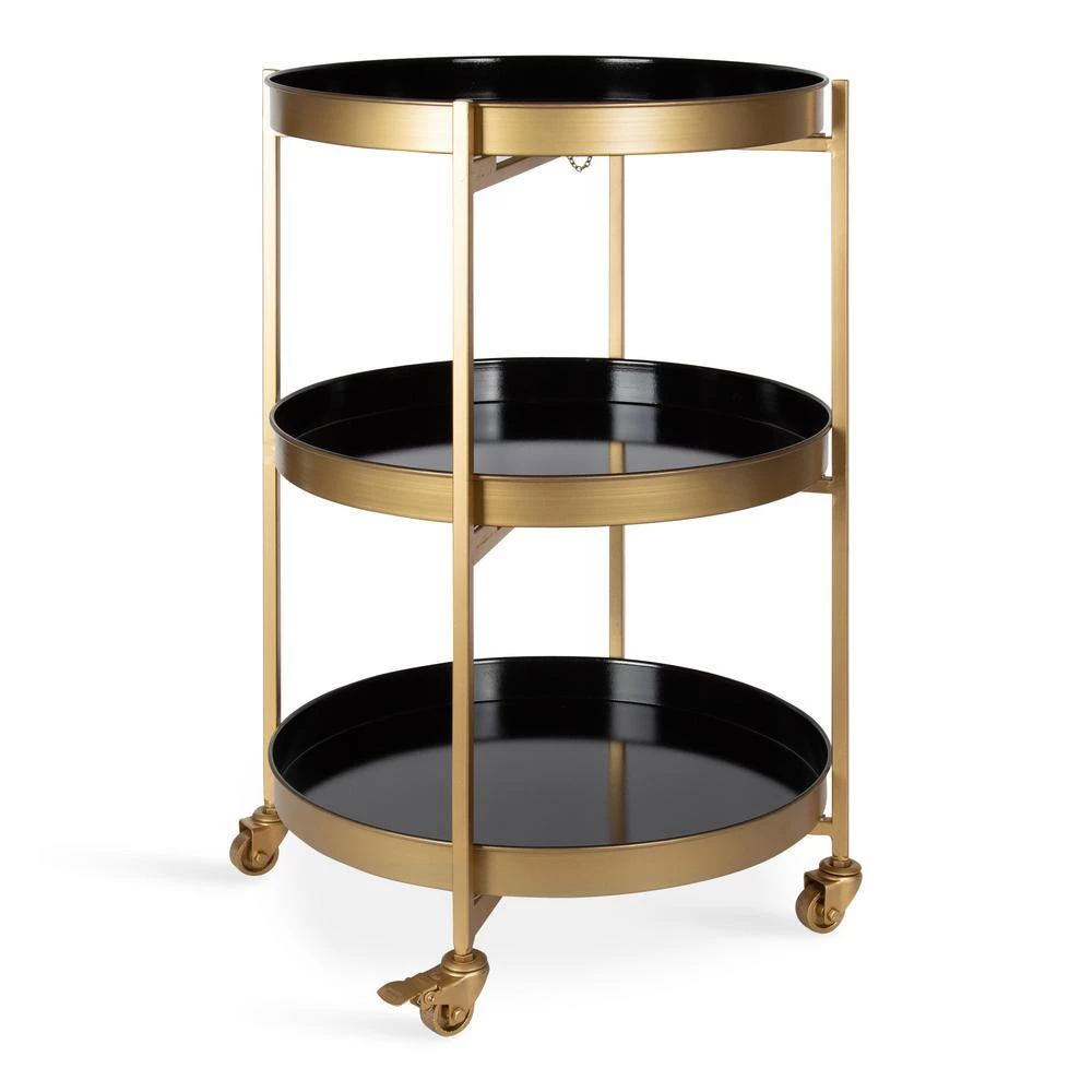 Elevate your next dinner or cocktail get-together with a beautifully modern glam bar cart from Kate and Laurel. The Celia bar cart features a trendy round design and a 3-tier style for maximum storage capacity. It takes only seconds to set up with a no-tools assembly. Each tray tier attaches magnetically to the fold-able frame, providing you with 3-trays that are not only elegant but portable. Serve cocktails, small plates, and more on the 18 in. Dia trays, or simply use them to store wine, spirits, and glasses. The entire cart also features 4-wheels that lock for quick stop-and-go between rooms, which is perfect for get-togethers that have frequent changes in scenery. The Celia bar cart relishes in its glam style, featuring a gold and black 2-tone finish that’s both sophisticated and modern. This design makes the glam bar cart into a multi-functional accent piece: Use it for toiletries or makeup in your master bathroom, decor in your living room, or serving in the kitchen or dining room.