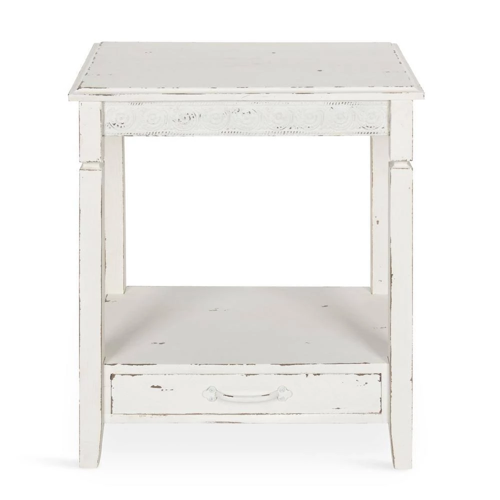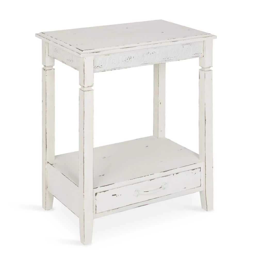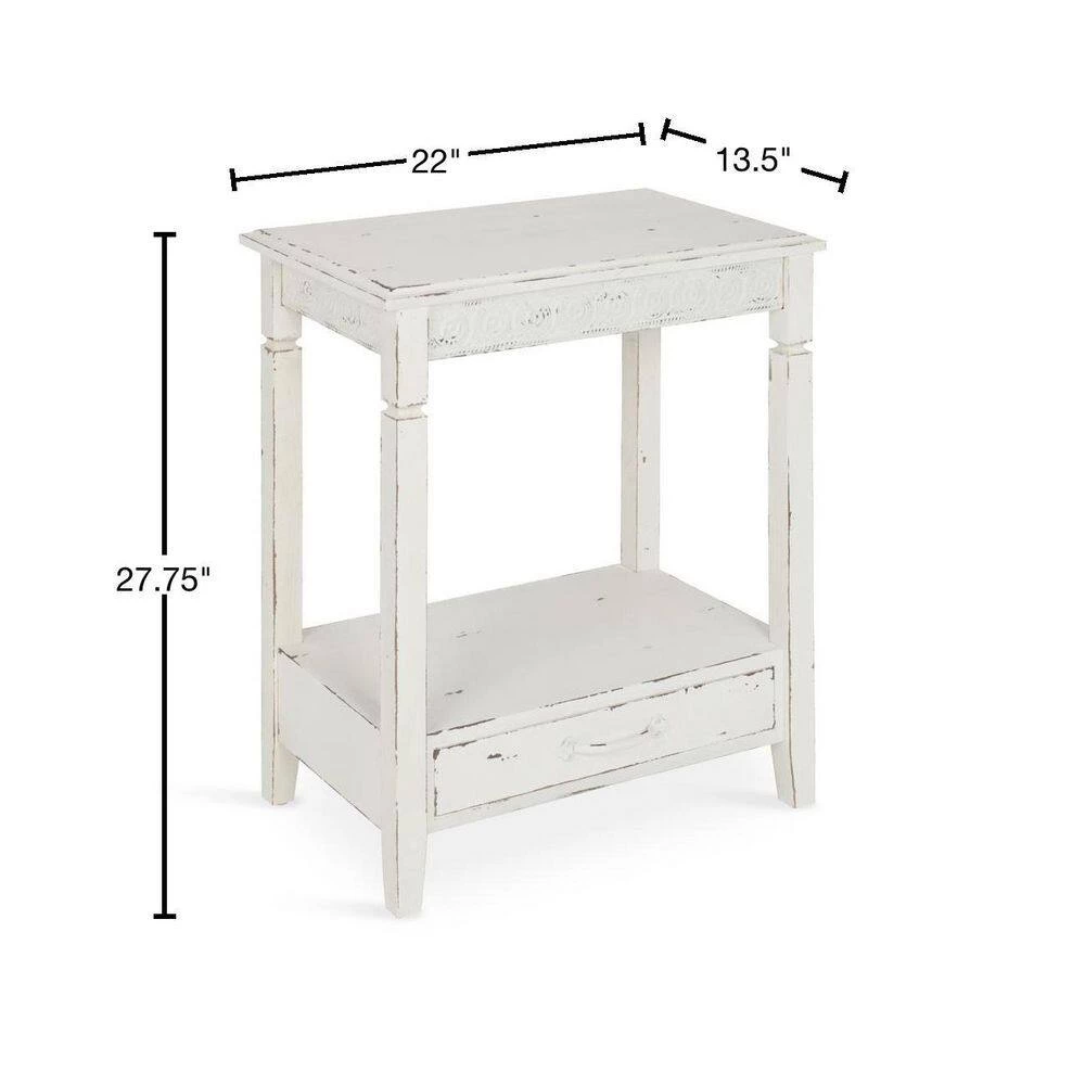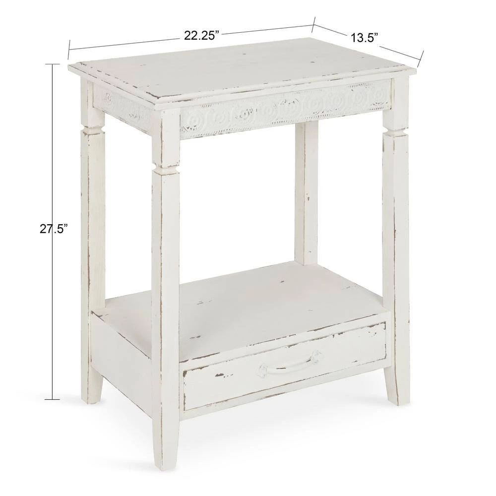 The country cottage style of the Kate and Laurel Idabelle side table will be your new favorite. It’s the perfect style to complement everything from a modern city condo to a rustic cabin in the woods. A well-placed lamp or a funky accent piece will complete the look in a bedroom, hallway or anywhere in your home you need an unpretentious end table. The bottom drawer is deep and wide enough to store a few magazines or all your bedside necessities and the shelf will display an array of your favorite books or be the perfect place for that beautiful potted plant you haven’t quite found the right spot for yet. Built and designed to last – yet lightweight enough to easily be moved around as the situation arises, this accent table can wear many hats. The dimensions are 27.5 inches tall by 22.25 inches wide by 13.5 inch deep.