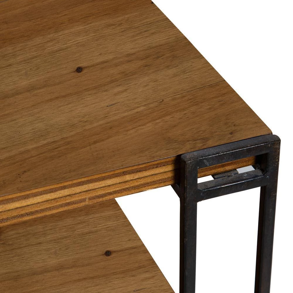 - Strong, black metal frame supports solid wood shelves that have been finished in a warm caramel, instructions are included for easy assembly and glides are attached to the legs for floor protection