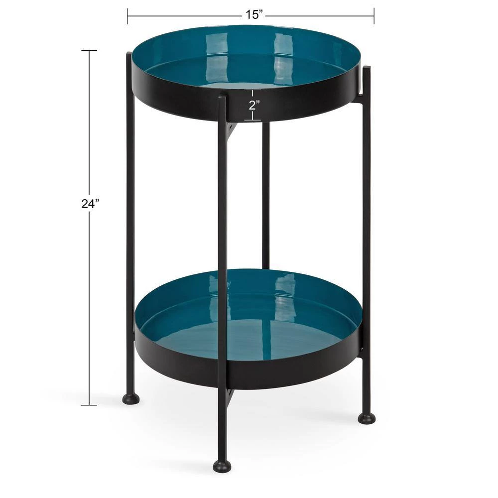 Experience a table that combines modern design with smart and efficient storage capacity with the Nira 2-Tier Modern Side Table from Kate and Laurel. This end table features 2-shelves with a Dia of 15 in., providing you plenty of tabletop space for small, decorative items, media remotes, photos, blankets, and even small plants. Each tabletop has a glossy enamel finish, highlighting the delicate, decorative design of this table. Featuring a metal frame with a black finish and teal tabletop shelves, the Nira side table provides an excellent accent piece for any room in your home. The tray tiers can also be removed for serving your favorite snacks, cocktails, and other drinks, with protective bumpers on the bottom to prevent scuffing and scratching. Display this 2-tier side table in your entryway, bathroom, bedroom, or anywhere else that needs a chic, contemporary touch. You can even use it as a bar cart in your kitchen. With a height of 24 in. tall , this table makes an excellent accent next to a couch or chair in your living room. Setup and portability are a cinch thanks to a pop-up design that’s ready in minutes. It even has protective rubber foot pads to prevent damage to your floors. With plenty of utility and intelligent design, there’s no reason not to choose this smart and efficient side table for your home.