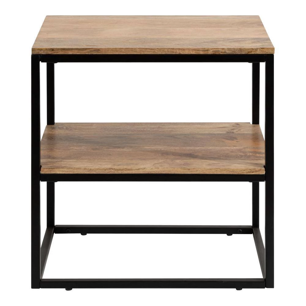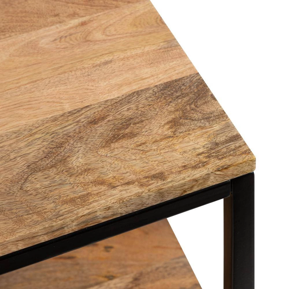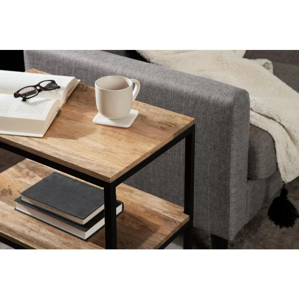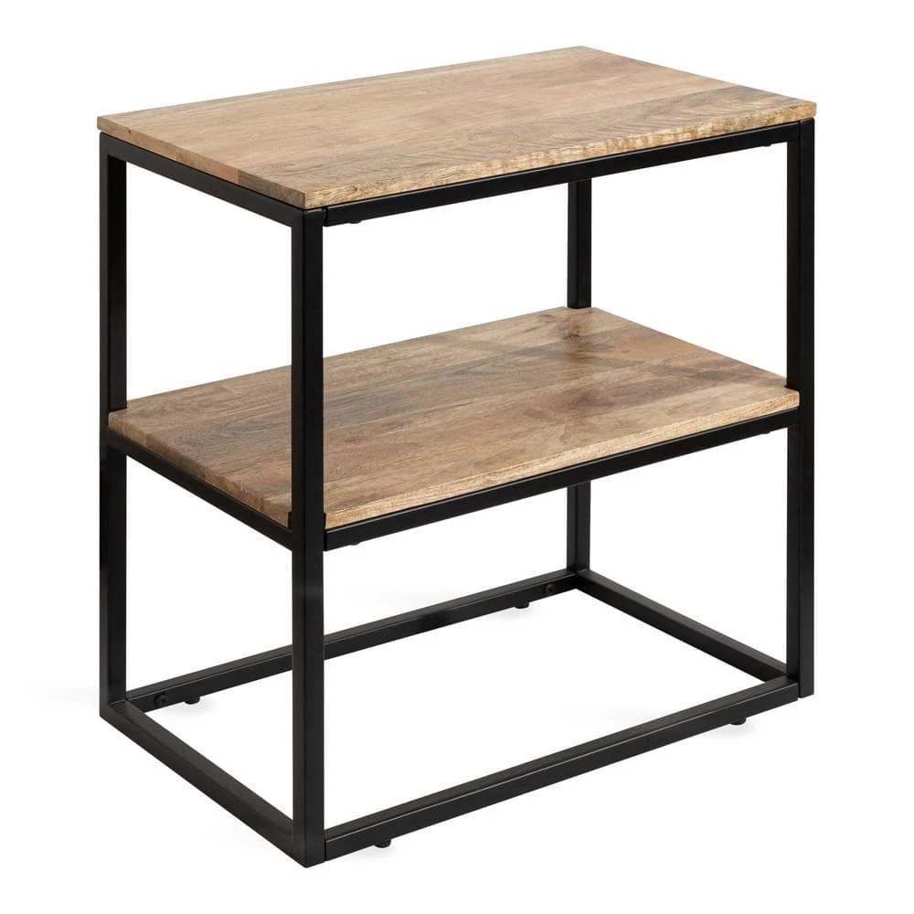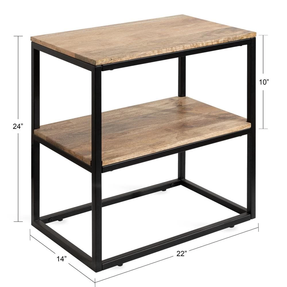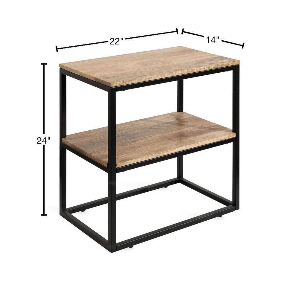 The Quarles table brings refined sophistication to your functional home decor. This side table puts a modern twist on classic farmhouse aesthetics, featuring a rectangular two-tier design with a neutral two-tone natural wood and black finish. The frame of this table was made of robust iron material, while each tier is crafted with a solid mango wood material. This end table is brought to life in India by skilled artisans that craft it by hand, giving each piece in this collection a distinct and one-of-a-kind look in terms of finish and woodgrain. The overall dimensions of the Quarles are 22 in. wide x 14 in. deep x 24 in. tall , making a fabulous pairing with your farmhouse-style couch, armchair, or bed. The two tiers bring multiple functions to your home, serving as a display surface for family photos, treasured keepsakes, or brilliant succulents. The lower tier is also fabulous for storing household necessities, allowing you to create a small bookshelf, storage for blankets, or an area for keeping your household keepsakes within arm’s reach. This table assembles in a matter of minutes with a 4-step process.