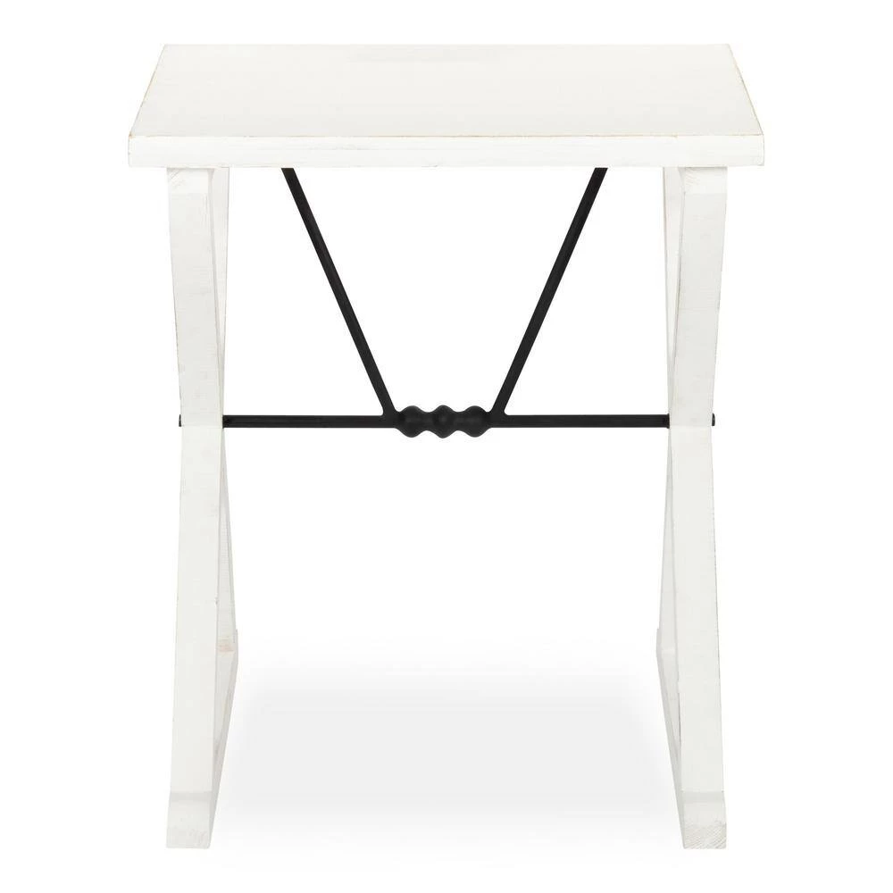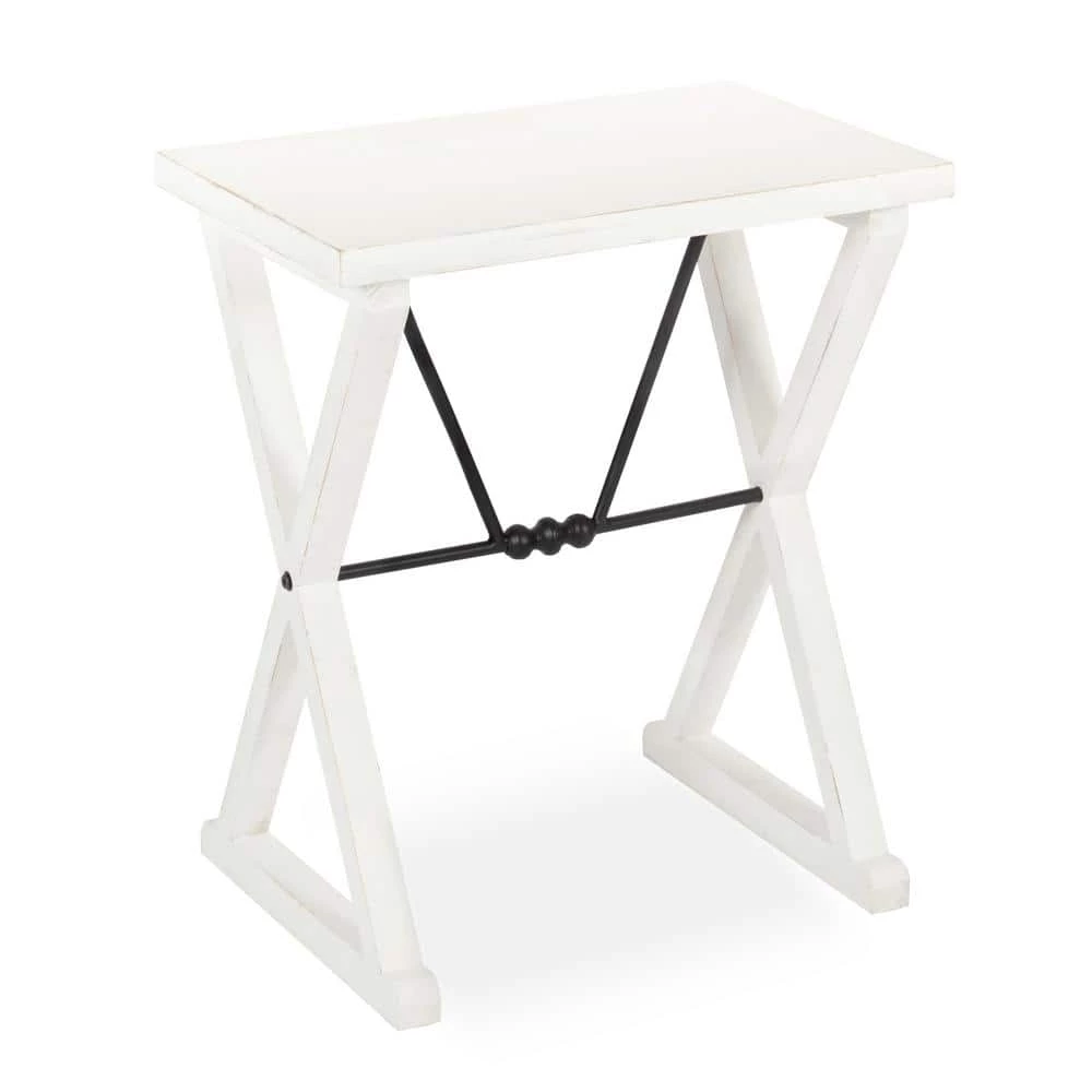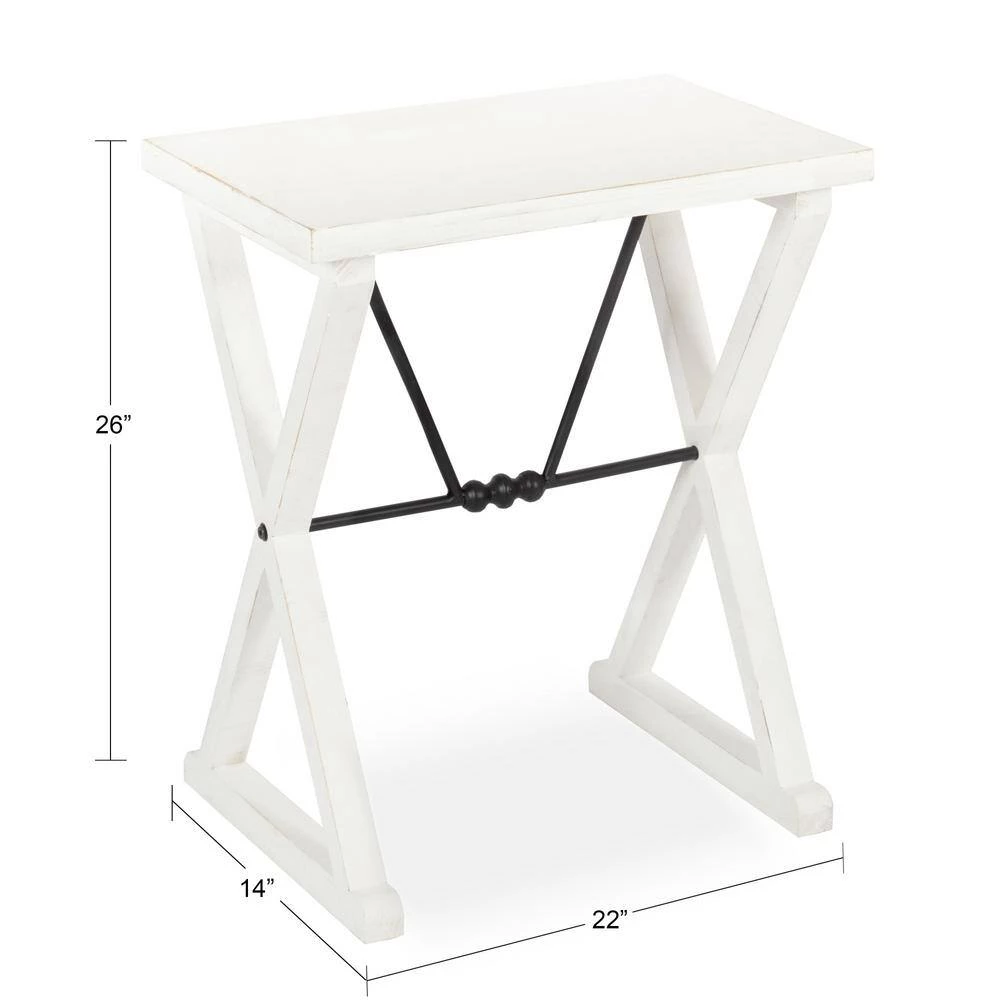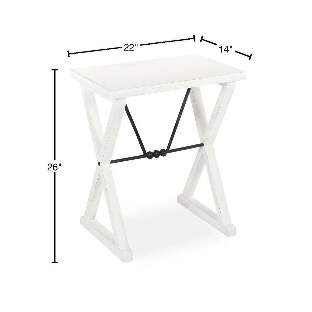 Store and display your favorite keepsakes and household necessities in rustic fashion with the Travere side table. This collection of tables features a lovely, simple design with trestle legs and a farmhouse look. The trestle legs and tabletop are solid wood distressed by hand to achieve a one-of-a-kind look, while the metal crossbar adds an ornate, colonial detailing. The overall display dimensions of this end table are 22 in. wide x 14 in. deep x 26 in. tall , giving you plenty of room to use it as a display for your decorative plants, photos, keepsakes, and household necessities. You can also use this accent piece for the storage of books, media remotes, magazines, and drinks on coasters. Your entryway, living room, or bedroom floor surfaces will also be protected from scuffing and damage thanks to the protective pads attached to the bottom of the legs. Assembly for the Travere table takes only a matter of minutes with easy-to-follow, 3-step instructions included.