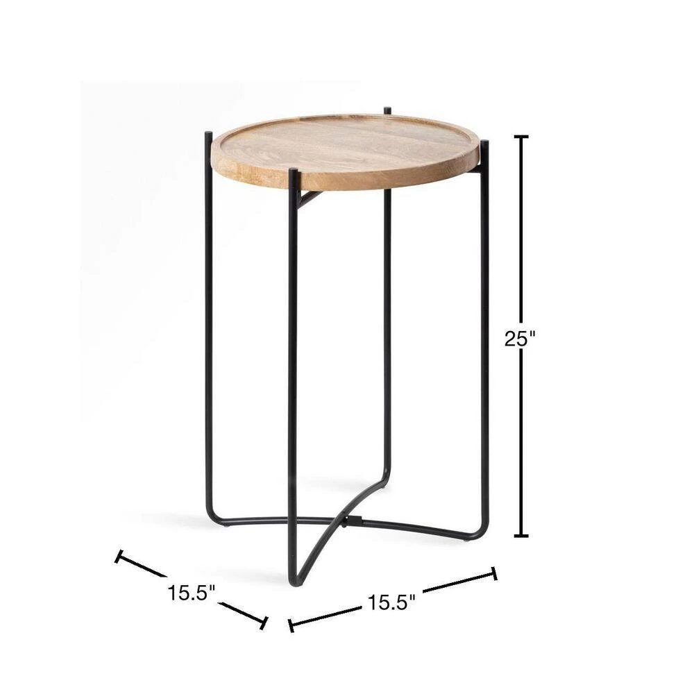 Add a statement piece that reflects your modern taste with the Vale side table from Kate and Laurel. Inspired by minimalist design, the Vale side table has clean, simple lines within its legs and a round tabletop. The tabletop itself is made from solid mango wood, handcrafted in India for a true one-of-a-kind, unique presence in your home. The Vale table’s legs are made from a high-quality iron material, giving it a resilient and sturdy base to add to any room in the home. The iron frame’s added benefit is its foldability; this feature allows it to collapse on itself for easy storage and portability. This end table is 15.5 in. wide x 15.5 in. deep x 25 in. tall , making it a fantastic complement to your couch, loveseat, or bed. The table is fantastic for displaying decorative plants and photos, storing media remotes and bookmarked novels, or serving drinks on coasters. The Vale side table is ready to display in minutes thanks to the 4-step assembly process.