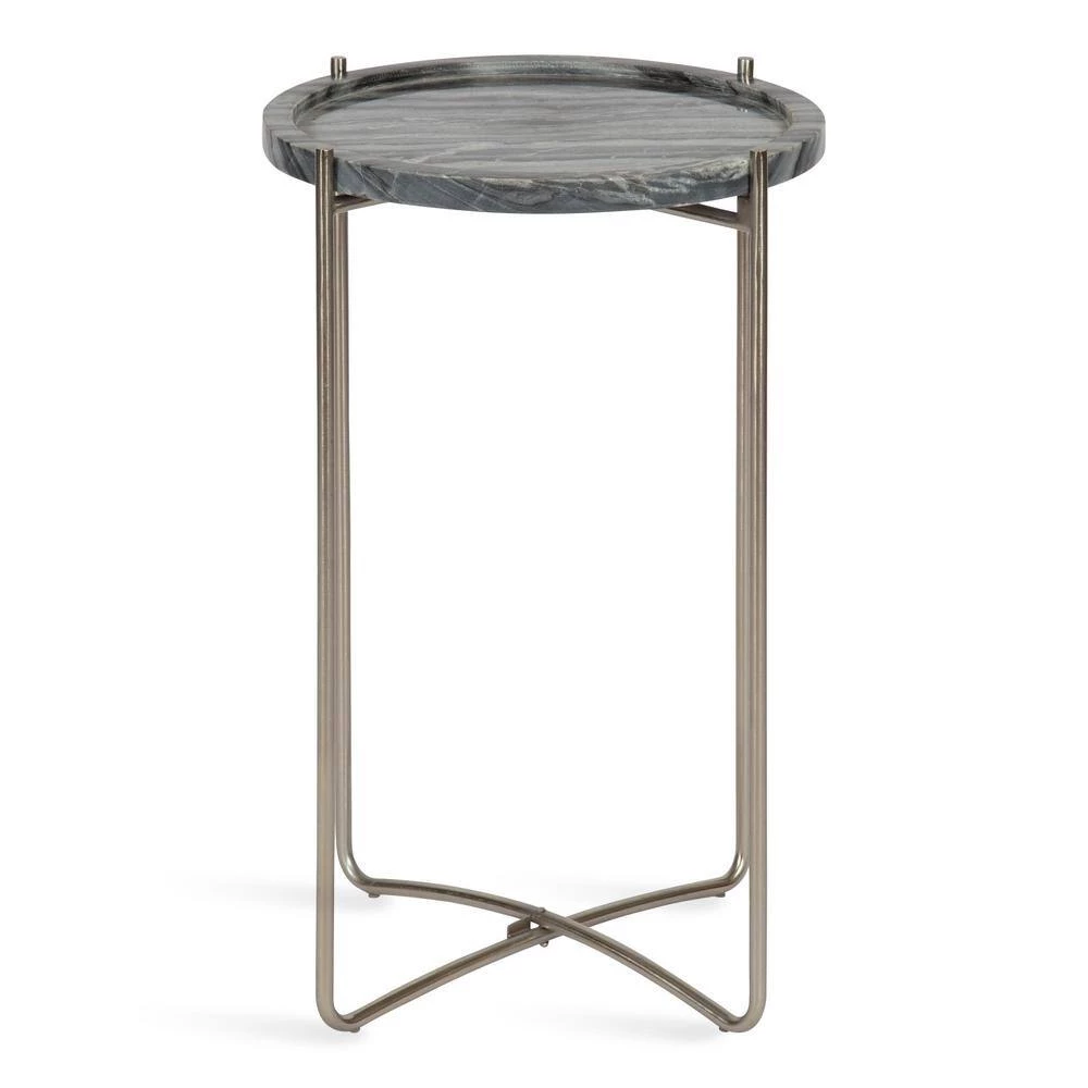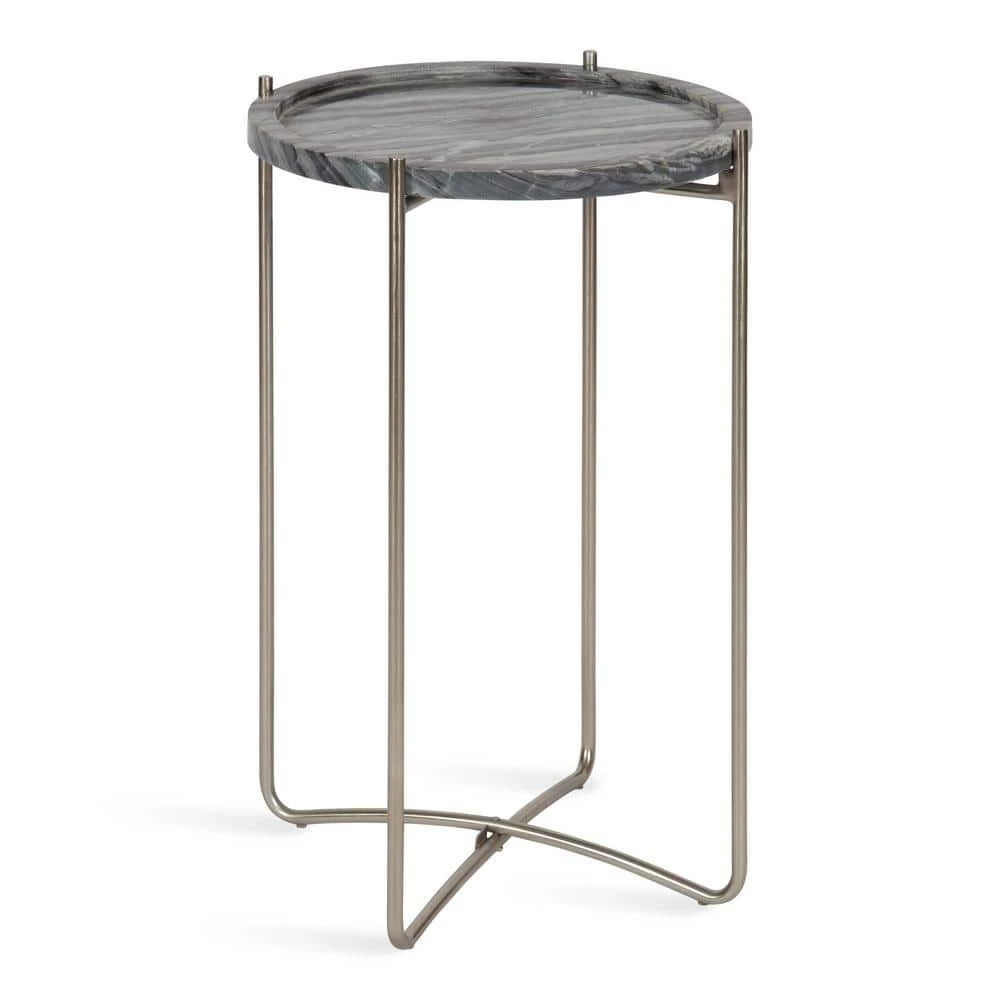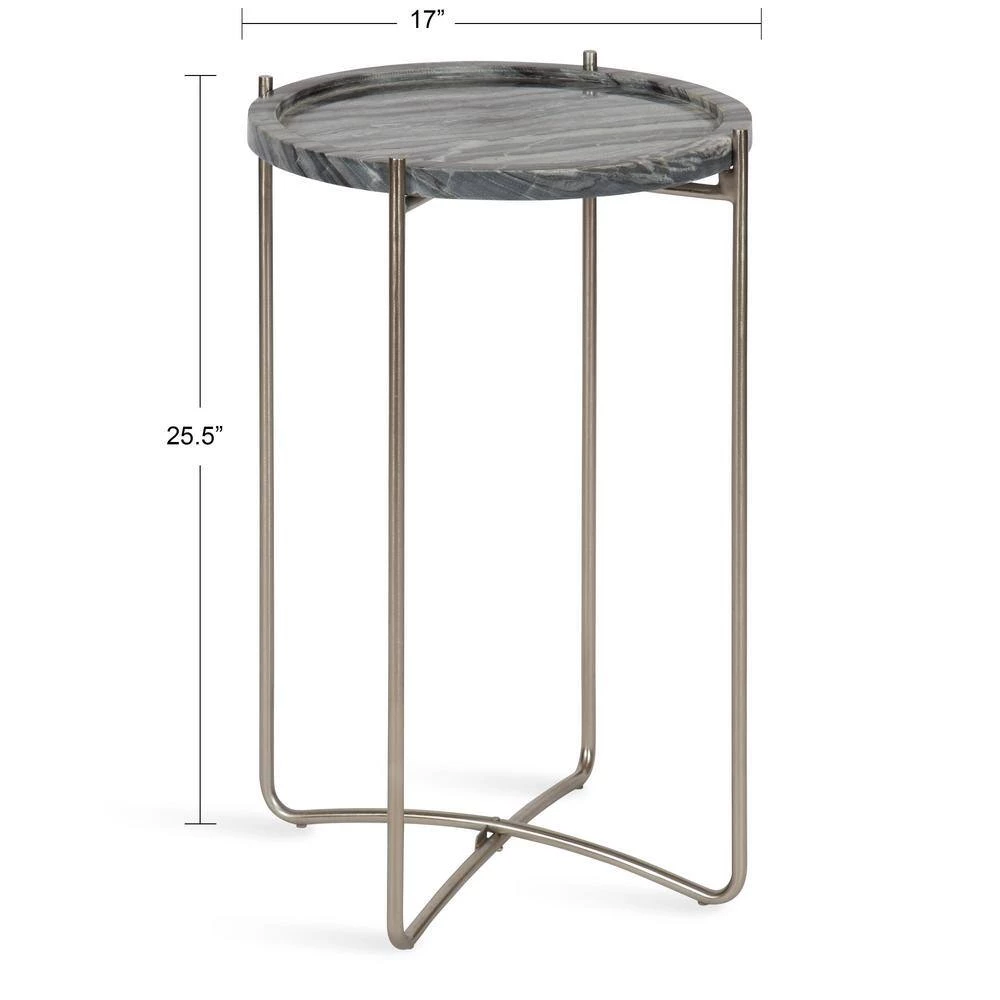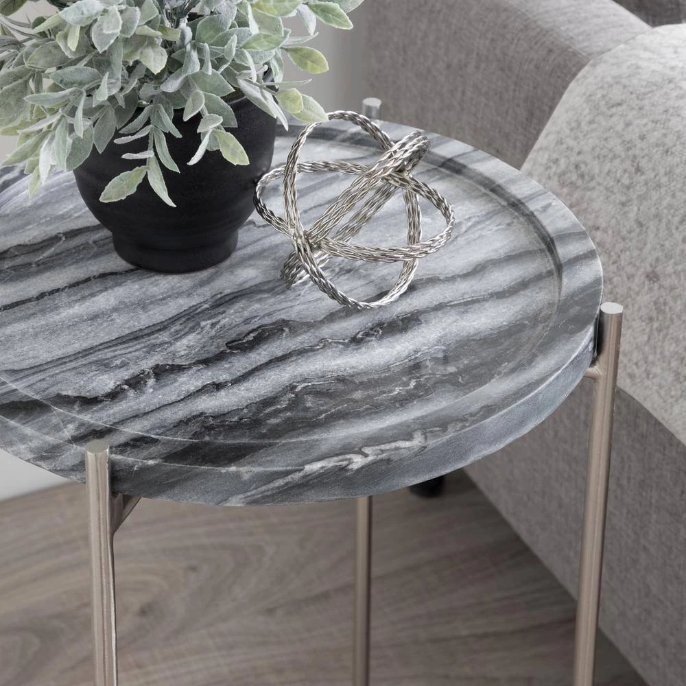 Add a statement piece that reflects your modern taste with the Vale side table from Kate and Laurel. Inspired by minimalist design, the Vale side table has clean, simple lines within its legs and a round tabletop. The tabletop itself is made from an elegant and authentic gray marble, handcrafted in India for a true one-of-a-kind outstanding presence in your home. The Vale table’s legs are made from a high-quality metal material, giving it a resilient and sturdy base to add to any room in the home. The metal frame’s added benefit is its foldability; this feature allows it to collapse on itself for easy storage and portability. This end table is 15.5 in. wide x 15.5 in. deep x 25 in. tall , making it a fantastic complement to your couch, loveseat, or bed. The table is fantastic for displaying decorative plants and photos, storing media remotes and bookmarked novels, or serving drinks on coasters. The Vale side table is ready to display in minutes thanks to the 4-step assembly process.